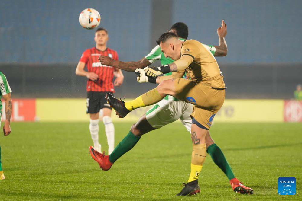 MONTEVIDEO, 24 julio, 2024 (Xinhua) -- Imagen del 23 de julio de 2024 del jugador Hugo Silveira (atrás), de Racing de Uruguay, disputando el balón con el guardameta Fabián Cerda (frente), de Huachipato de Chile, durante un partido correspondiente a los playoff de la Copa CONMEBOL Sudamericana celebrado en el estadio Centenario, en Montevideo, capital de Uruguay. (Xinhua/Nicolás Celaya)