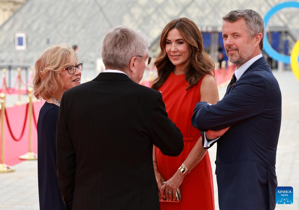 PARIS, 25 julio, 2024 (Xinhua) -- El presidente del Comité Olímpico Internacional (COI), Thomas Bach (2-i) y su esposa Claudia Bach (i) saludan al rey danés Federico X (d) y la reina María mientras asisten a la Cena del COI y el Elíseo en el Louvre, en París, Francia, el 25 de julio de 2024. (Xinhua/Arturo Holmes/POOL)