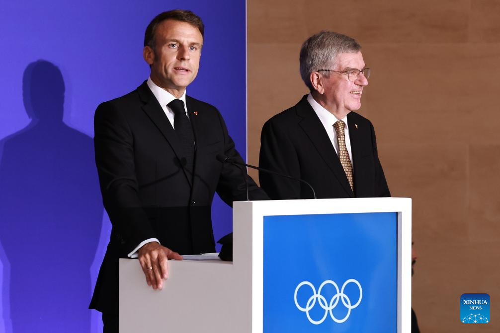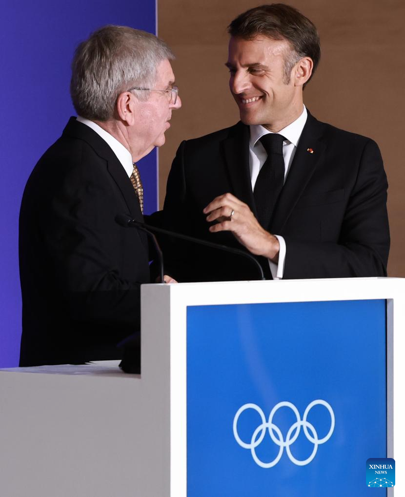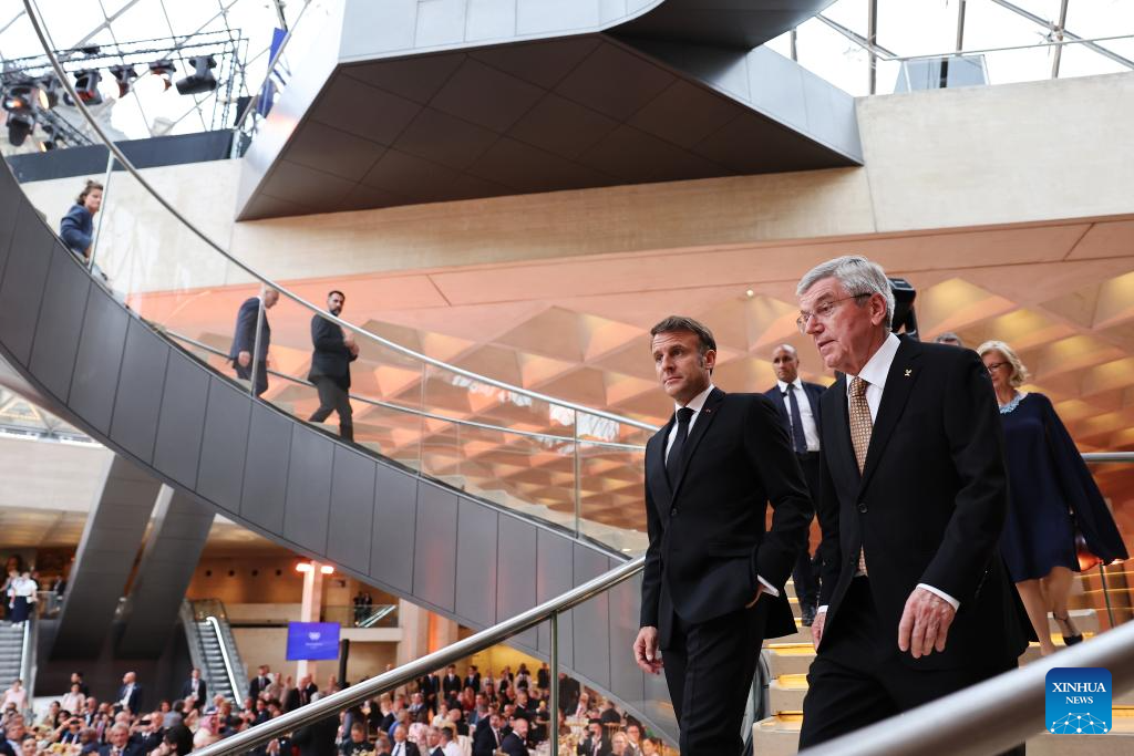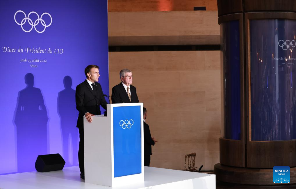 PARIS, 25 julio, 2024 (Xinhua) -- El presidente del Comité Olímpico Internacional (COI), Thomas Bach (d-frente) y el presidente francés Emmanuel Macron asisten a la Cena del COI y el Elíseo en el Louvre, en París, Francia, el 25 de julio de 2024. (Xinhua/Arturo Holmes/POOL)