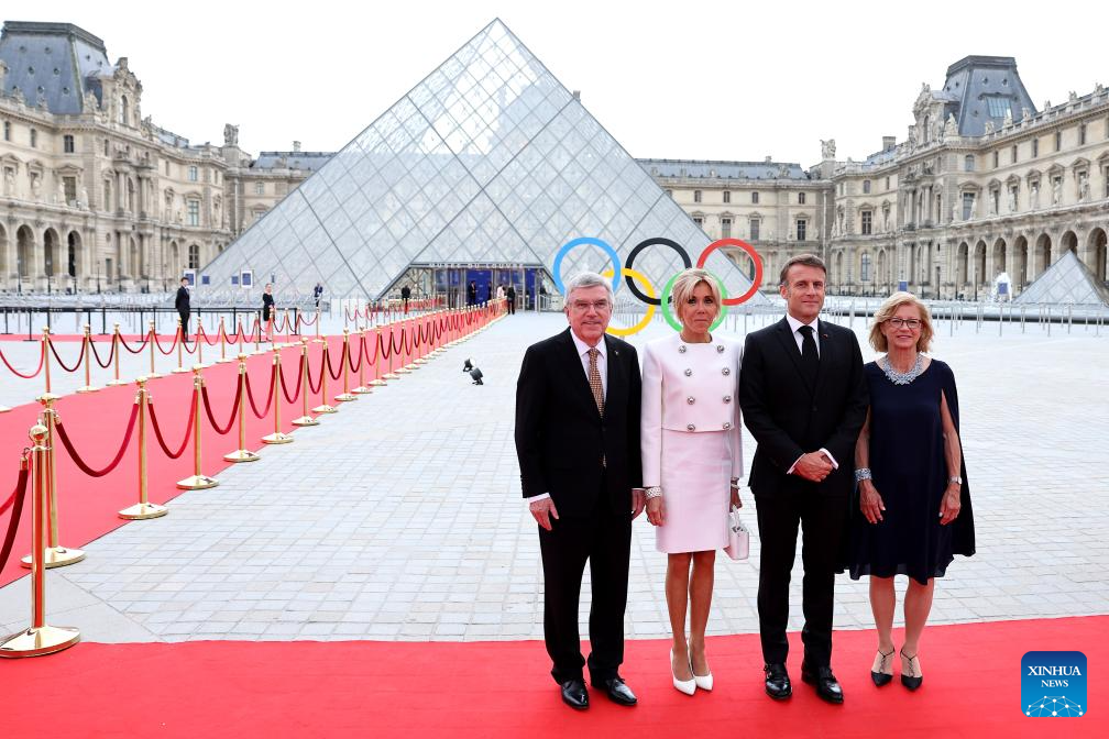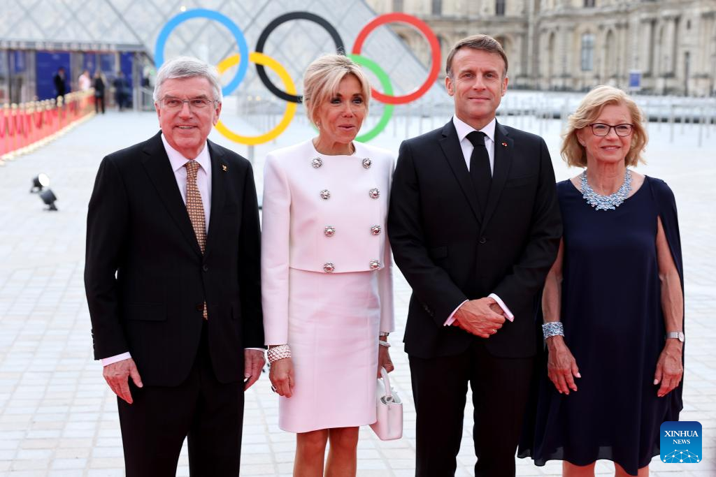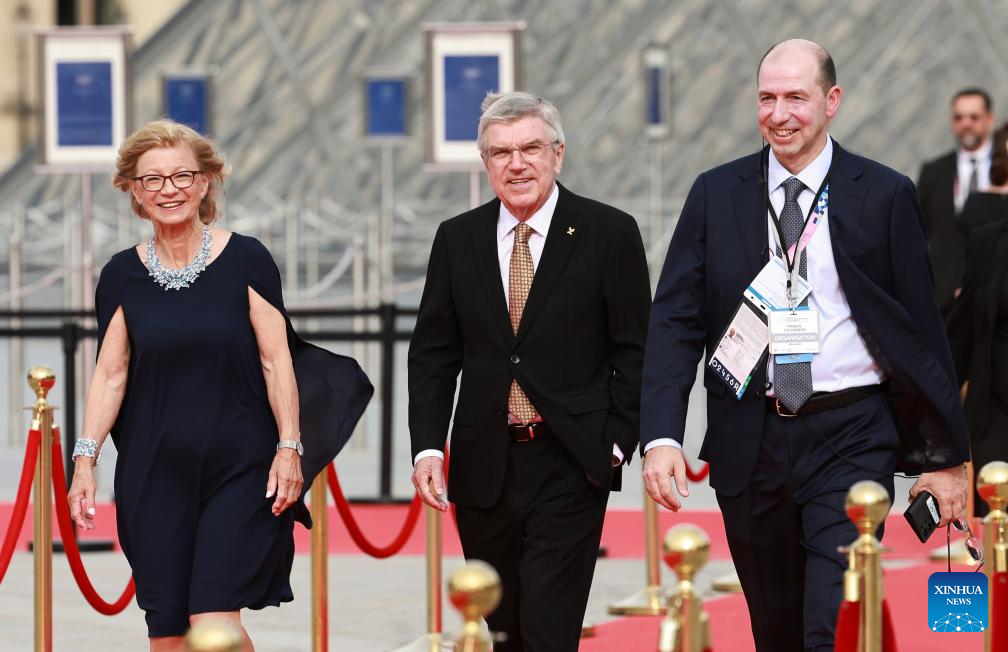 PARIS, 25 julio, 2024 (Xinhua) -- El presidente del Comité Olímpico Internacional (COI), Thomas Bach (c) y su esposa Claudia Bach (i) asisten a la Cena del COI y el Elíseo en el Louvre, en París, Francia, el 25 de julio de 2024. (Xinhua/Arturo Holmes/POOL)