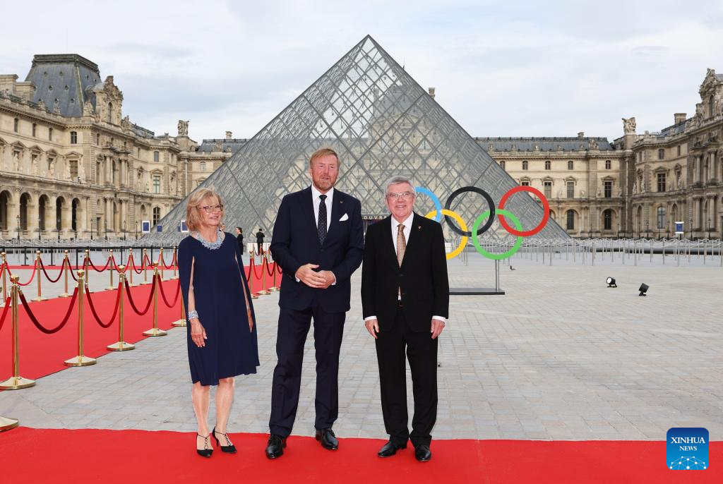 PARIS, 25 julio, 2024 (Xinhua) -- El presidente del Comité Olímpico Internacional (COI), Thomas Bach (d) y su esposa Claudia Bach (i) posan con el rey de Países Bajos Guillermo Alejandro mientras asisten a la Cena del COI y el Elíseo en el Louvre, en París, Francia, el 25 de julio de 2024. (Xinhua/Arturo Holmes/POOL)