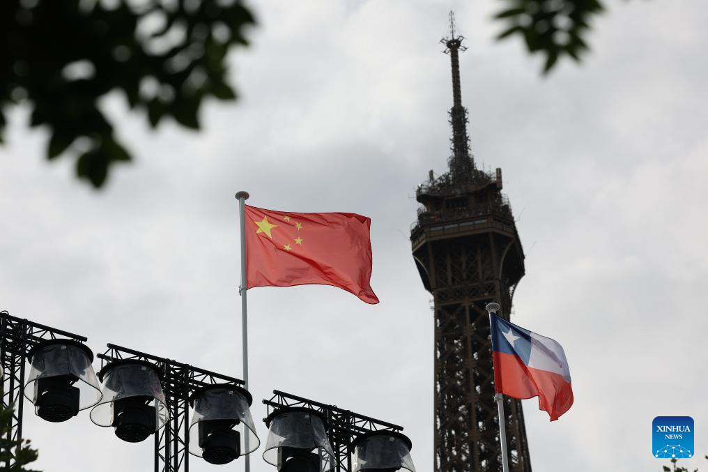 PARIS, 25 julio, 2024 (Xinhua) -- Una bandera nacional china (i) es retratada en el Estadio Torre Eiffel, el cual sirve como sede de voleibol de playa olímpico, en París, Francia, el 25 de julio de 2024. Los eventos de voleibol de playa de los Juegos Olímpicos de París 2024 se llevará a cabo en el Estadio Torre Eiffel en el Champ de Mars en París del 27 de julio al 10 de agosto. (Xinhua/Huang Zongzhi)