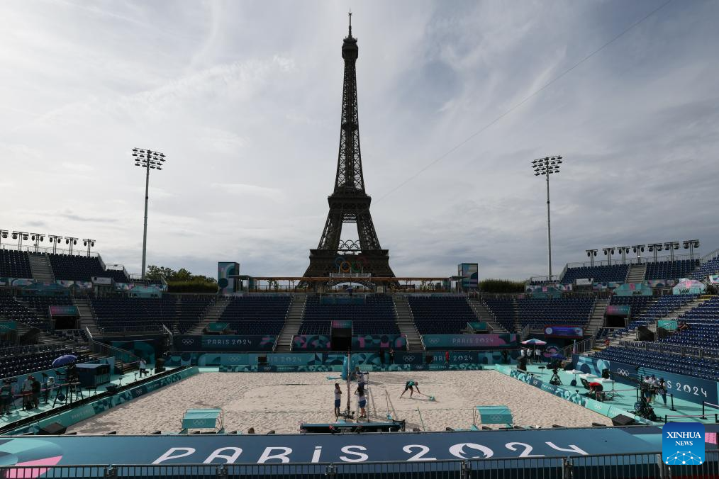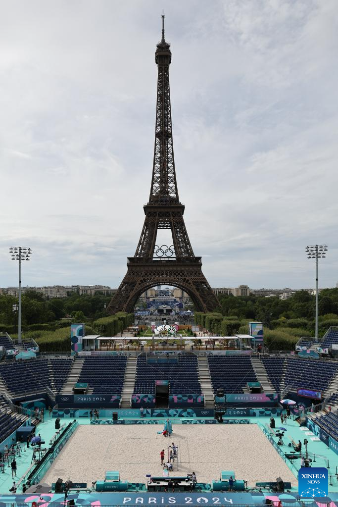 PARIS, 25 julio, 2024 (Xinhua) -- Imagen del 25 de julio de 2024 de un vista del Estadio Torre Eiffel, el cual sirve como sede de voleibol de playa olímpico, en París, Francia. Los eventos de voleibol playa de los Juegos Olímpicos de París 2024 se llevará a cabo en el Estadio Torre Eiffel en el Champ de Mars en París del 27 de julio al 10 de agosto. (Xinhua/Huang Zongzhi)