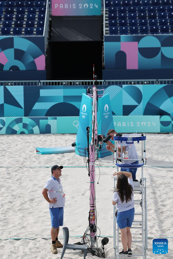 PARIS, 25 julio, 2024 (Xinhua) -- Trabajadores realizan preparativos en el Estadio Torre Eiffel, el cual sirve como sede de voleibol de playa olímpico, en París, Francia, el 25 de julio de 2024. Los eventos de voleibol de playa de los Juegos Olímpicos de París 2024 se llevará a cabo en el Estadio Torre Eiffel en el Champ de Mars en París del 27 de julio al 10 de agosto. (Xinhua/Huang Zongzhi)