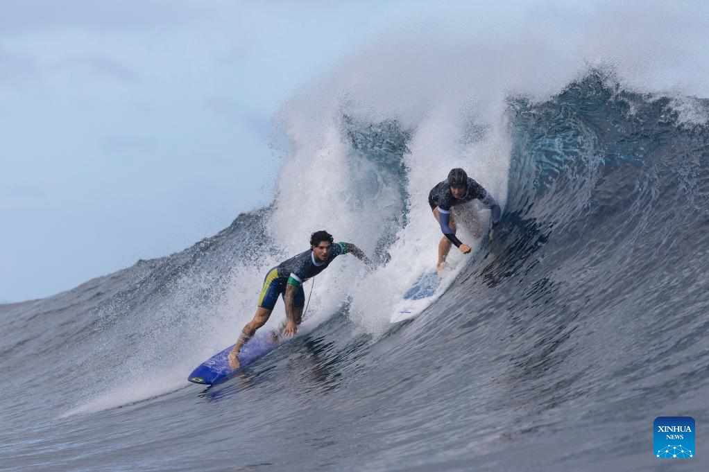 TAHITI, 25 julio, 2024 (Xinhua) -- Imagen del 24 de julio de 2024 de Anat Lelior (d) de Israel robando la ola a Gabriel Medina de Brasil durante una sesión de entrenamiento de surf previo a los Juegos Olímpicos de París 2024, en Teahupo'o, Tahití, Polinesia Francesa. (Xinhua/Ed Sloane/POOL)