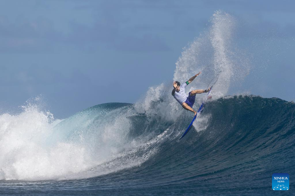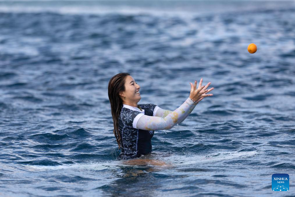 TAHITI, 25 julio, 2024 (Xinhua) -- Imagen del 24 de julio de 2024 de Matsuda Shino de Japón reaccionando durante una sesión de entrenamiento de surf previo a los Juegos Olímpicos de París 2024, en Teahupo'o, Tahití, Polinesia Francesa. (Xinhua/Ed Sloane/POOL)
