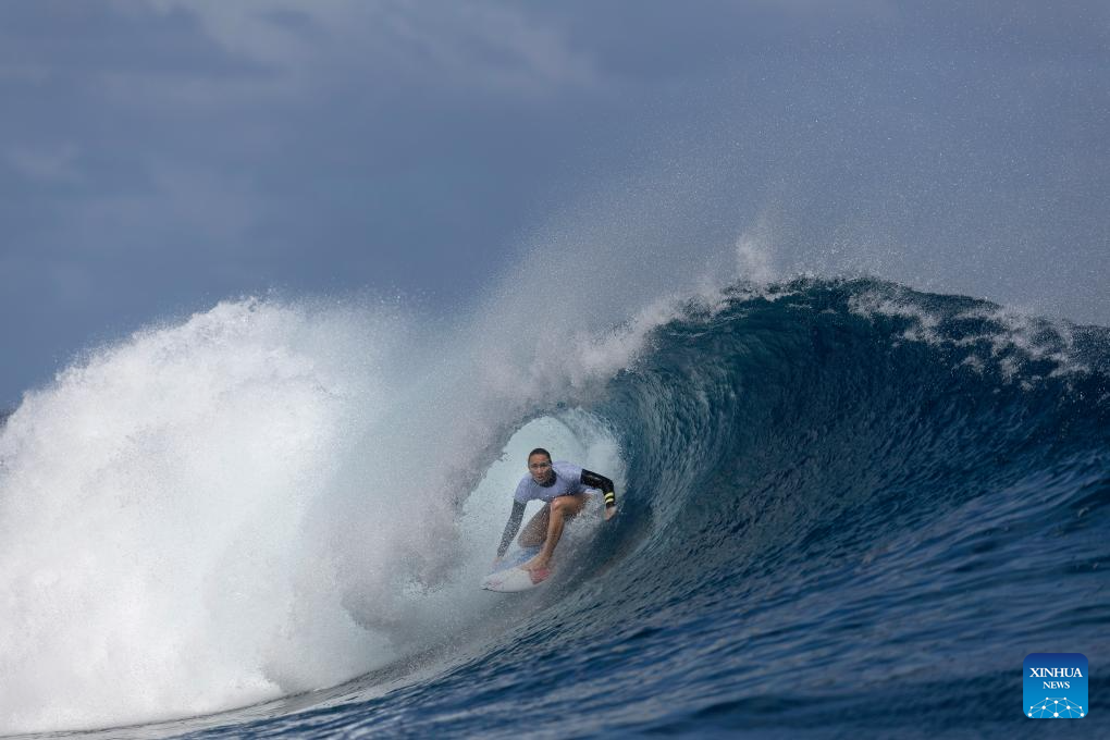 TAHITI, 25 julio, 2024 (Xinhua) -- Imagen del 24 de julio de 2024 de Gabriel Medina de Brasil montando una ola durante una sesión de entrenamiento de surf previo a los Juegos Olímpicos de París 2024, en Teahupo'o, Tahití, Polinesia Francesa. (Xinhua/Ed Sloane/POOL)