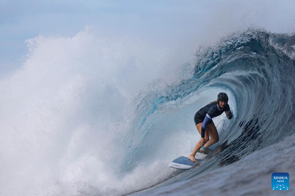 TAHITI, 25 julio, 2024 (Xinhua) -- Imagen del 24 de julio de 2024 de Anat Lelior de Israel montando una ola durante una sesión de entrenamiento de surf previo a los Juegos Olímpicos de París 2024, en Teahupo'o, Tahití, Polinesia Francesa. (Xinhua/Ed Sloane/POOL)