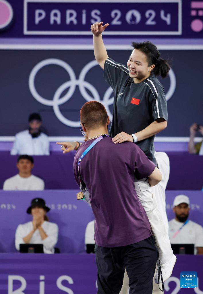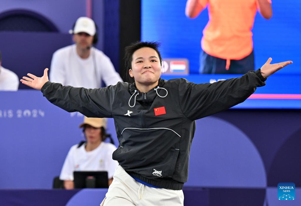 PARIS, 9 agosto, 2024 (Xinhua) -- Liu Qingyi (d) de China, conocida como B-Girl 671, festeja la victoria durante la batalla por la medalla de bronce de B-girls de breaking ante India Dewi Sardjoe de Países Bajos, conocida como B-Girl India, en los Juegos Olímpicos de París 2024, en París, Francia, el 9 de agosto de 2024. (Xinhua/Shen Bohan)