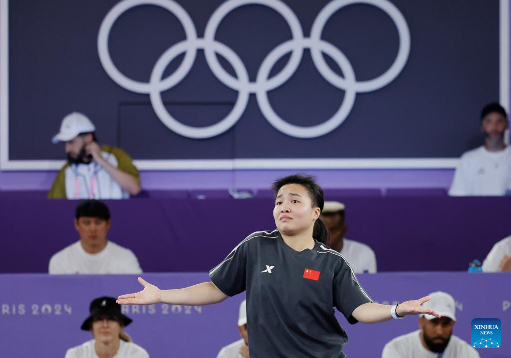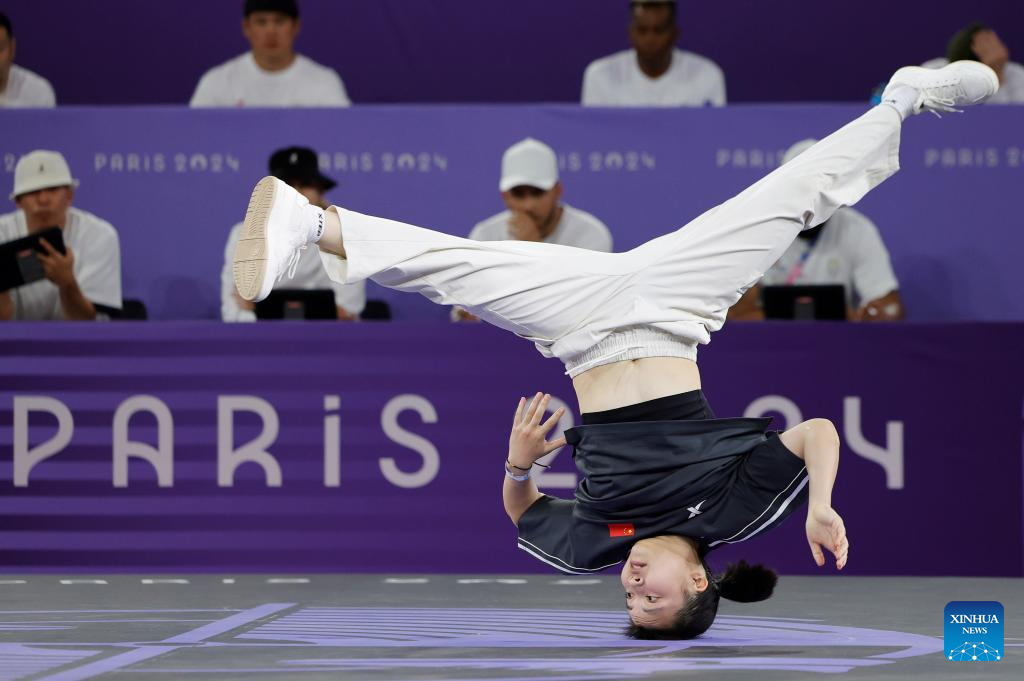 PARIS, 9 agosto, 2024 (Xinhua) -- Liu Qingyi de China, conocida como B-Girl 671, compite durante la batalla por la medalla de bronce de B-girls de breaking ante India Dewi Sardjoe de Países Bajos, conocida como B-Girl India, en los Juegos Olímpicos de París 2024, en París, Francia, el 9 de agosto de 2024. (Xinhua/Shen Bohan)
