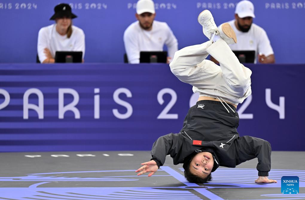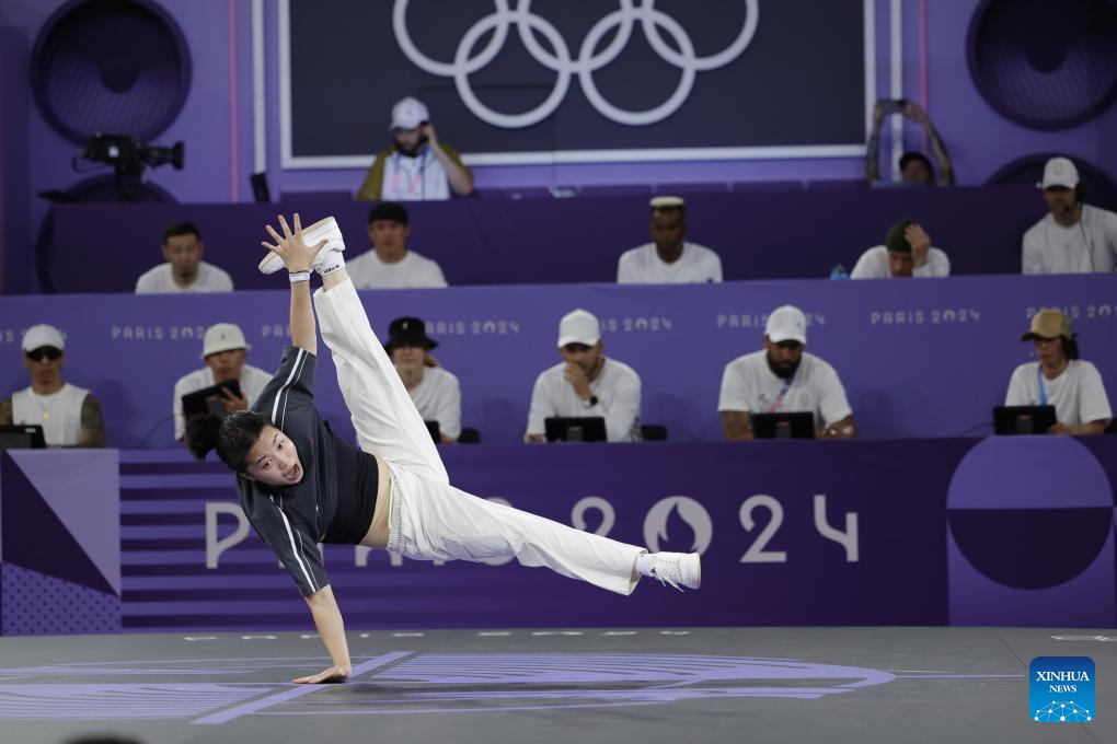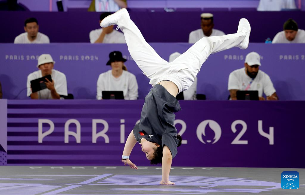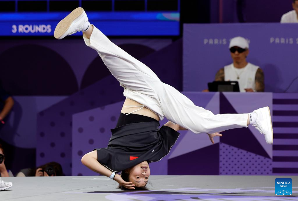 PARIS, 9 agosto, 2024 (Xinhua) -- Liu Qingyi de China, conocida como B-Girl 671, compite durante la batalla por la medalla de bronce de B-girls de breaking ante India Dewi Sardjoe de Países Bajos, conocida como B-Girl India, en los Juegos Olímpicos de París 2024, en París, Francia, el 9 de agosto de 2024. (Xinhua/Liu Yongzhen)