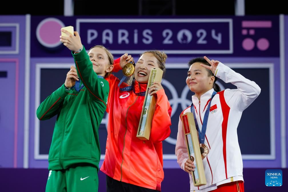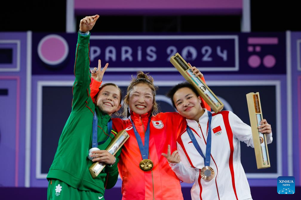 PARIS, 9 agosto, 2024 (Xinhua) -- La medallista de oro Yuasa Ami (c) de Japón, conocida como B-Girl Ami, la medallista de plata Dominika Banevic (i) de Lituania, conocida como B-Girl Nicka, y la medallista de bronce Liu Qingyi de China, conocida como B-Girl 671, posan para fotografías durante la ceremonia de victoria de B-girls de breaking en los Juegos Olímpicos de París 2024, en París, Francia, el 9 de agosto de 2024. (Xinhua/Shen Bohan)
