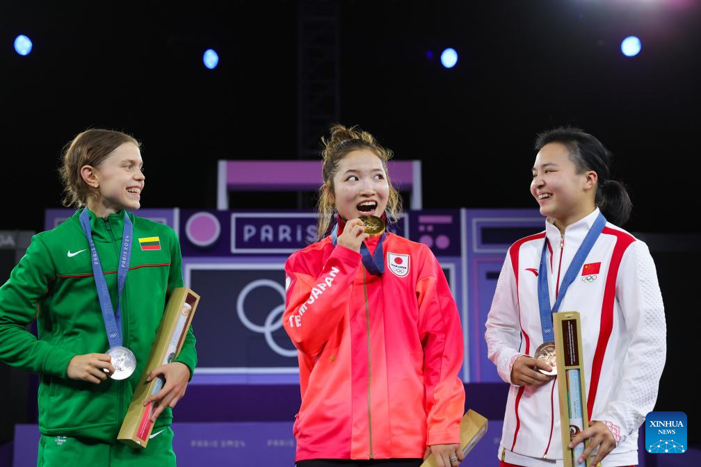 PARIS, 9 agosto, 2024 (Xinhua) -- La medallista de oro Yuasa Ami (c) de Japón, conocida como B-Girl Ami, la medallista de plata Dominika Banevic (i) de Lituania, conocida como B-Girl Nicka, y la medallista de bronce Liu Qingyi de China, conocida como B-Girl 671, asisten a la ceremonia de victoria de B-girls de breaking en los Juegos Olímpicos de París 2024, en París, Francia, el 9 de agosto de 2024. (Xinhua/Shen Bohan)