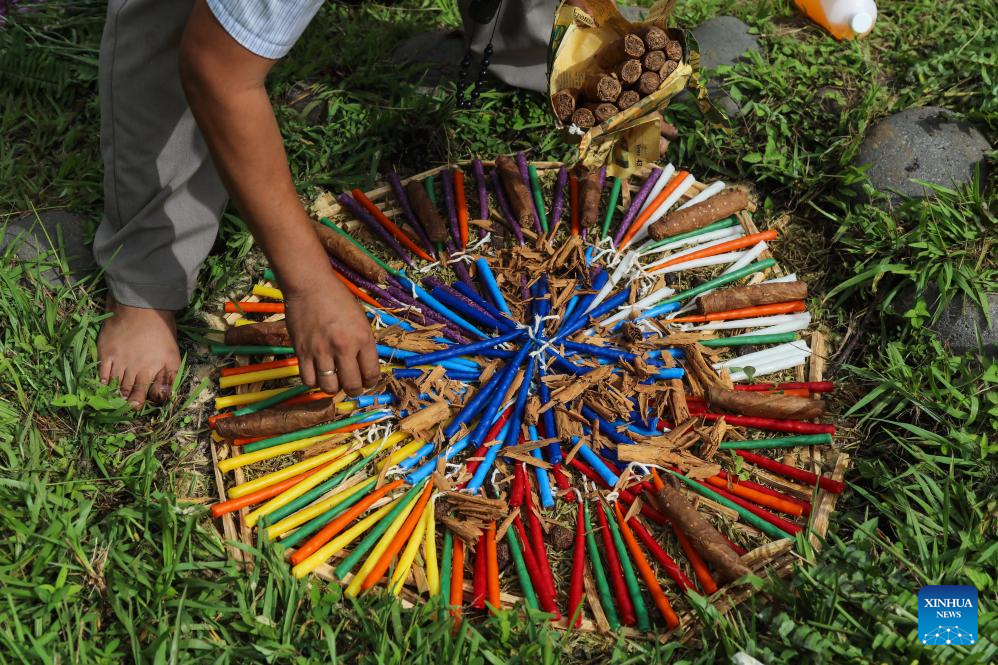 SONSONATE, 9 agosto, 2024 (Xinhua) -- Un indígena prepara un altar de fuego durante la celebración del Día Nacional e Internacional de los Pueblos Indígenas en el sitio sagrado "El Llanito", en el municipio de Izalco del departamento de Sonsonate, El Salvador, el 9 de agosto de 2024. Organizaciones indígenas de El Salvador conmemoraron el viernes el Día Nacional e Internacional de los Pueblos Indígenas con un acto en el emblemático sitio sagrado "El Llanito", que reivindicó los derechos,cosmovisión y formas de vida de las comunidades ancestrales del país centroamericano. (Xinhua/Alexander Peña)