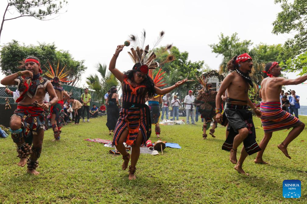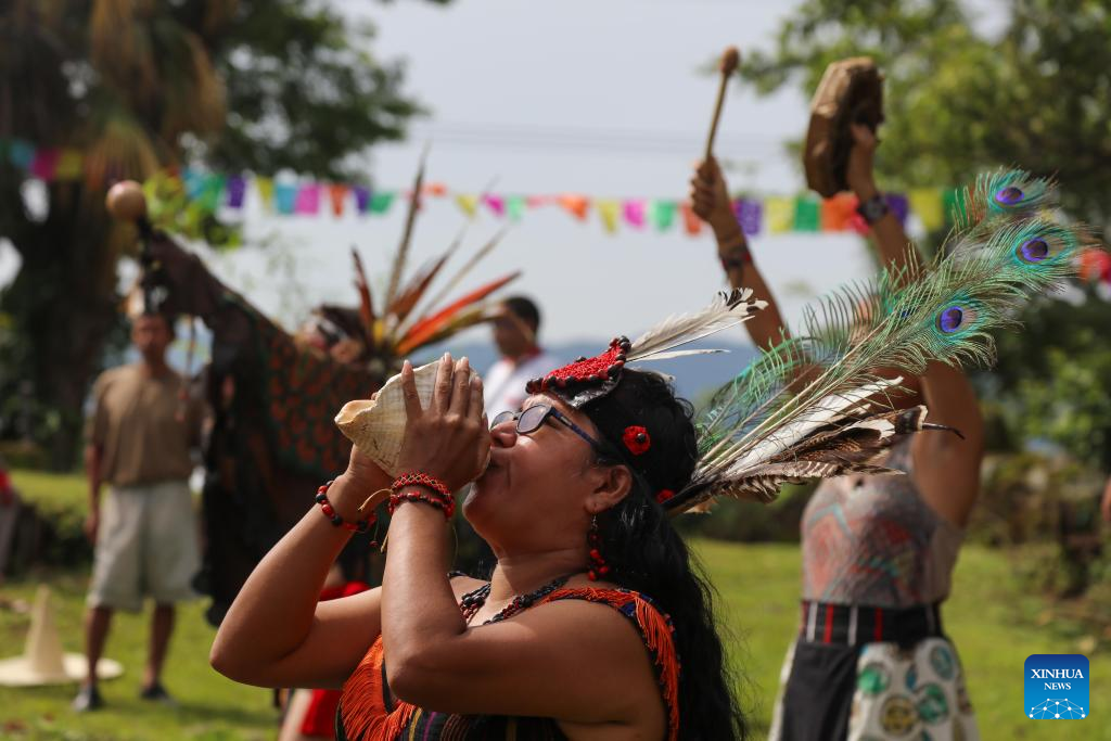 SONSONATE, 9 agosto, 2024 (Xinhua) -- Indígenas danzan durante la celebración del Día Nacional e Internacional de los Pueblos Indígenas en el sitio sagrado "El Llanito", en el municipio de Izalco del departamento de Sonsonate, El Salvador, el 9 de agosto de 2024. Organizaciones indígenas de El Salvador conmemoraron el viernes el Día Nacional e Internacional de los Pueblos Indígenas con un acto en el emblemático sitio sagrado "El Llanito", que reivindicó los derechos, cosmovisión y formas de vida de las comunidades ancestrales del país centroamericano. (Xinhua/Alexander Peña)