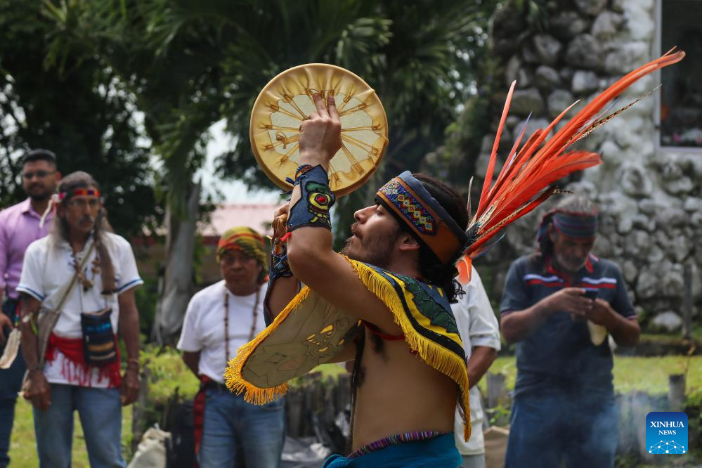 SONSONATE, 9 agosto, 2024 (Xinhua) -- Un indígena participa en la celebración del Día Nacional e Internacional de los Pueblos Indígenas en el sitio sagrado "El Llanito", en el municipio de Izalco del departamento de Sonsonate, El Salvador, el 9 de agosto de 2024. Organizaciones indígenas de El Salvador conmemoraron el viernes el Día Nacional e Internacional de los Pueblos Indígenas con un acto en el emblemático sitio sagrado "El Llanito", que reivindicó los derechos, cosmovisión y formas de vida de las comunidades ancestrales del país centroamericano. (Xinhua/Alexander Peña)