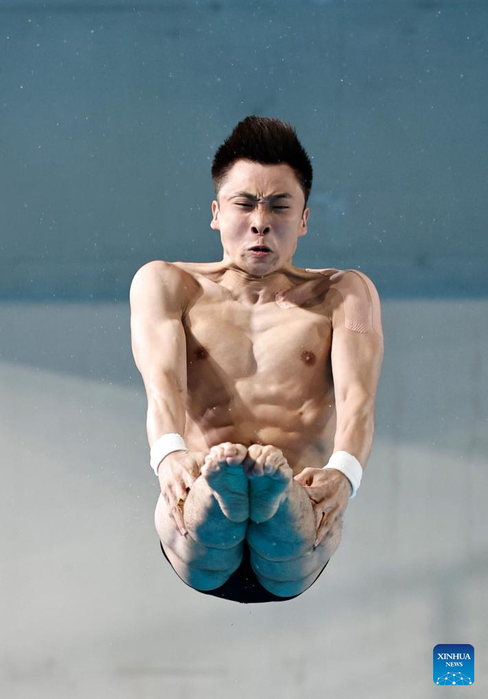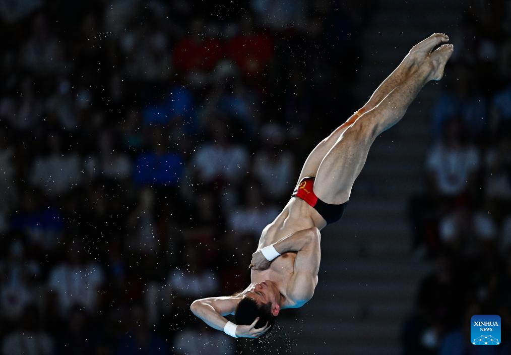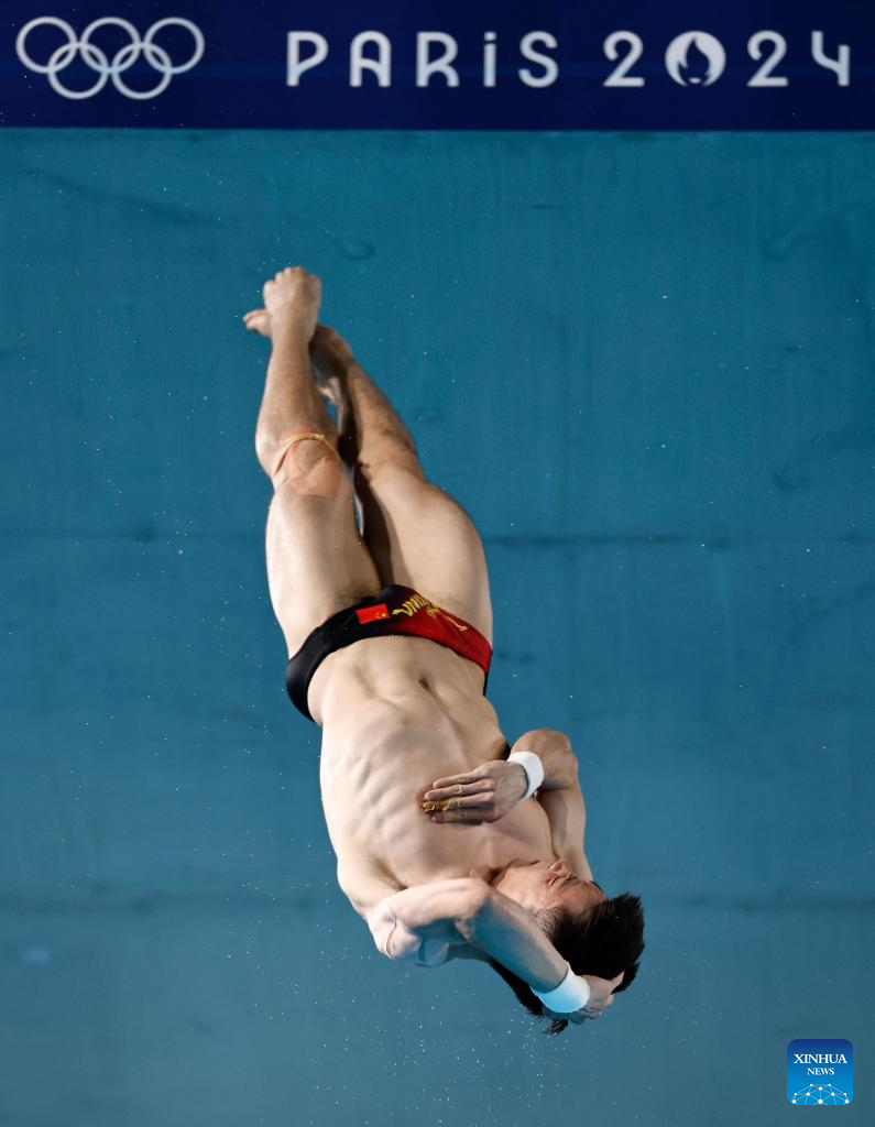 SAINT-DENIS, 10 agosto, 2024 (Xinhua) -- Cao Yuan de China compite durante la final de plataforma masculina de 10 metros de saltos en los Juegos Olímpicos de París 2024, en Saint-Denis, Francia, el 10 de agosto de 2024. (Xinhua/Wang Peng)