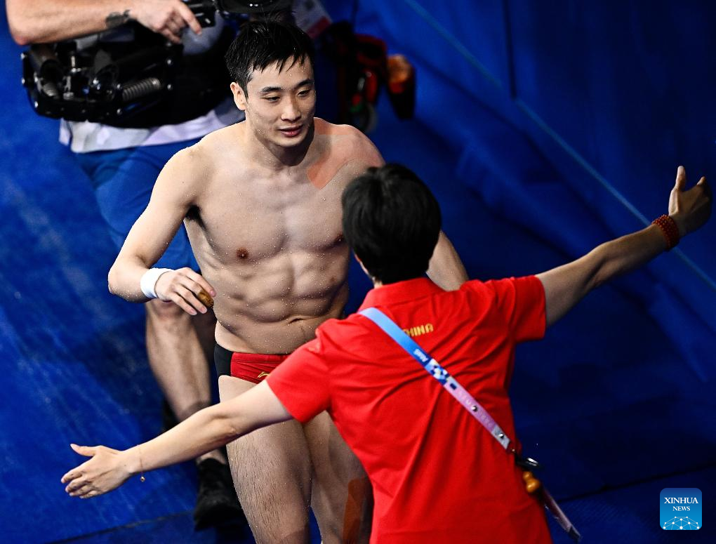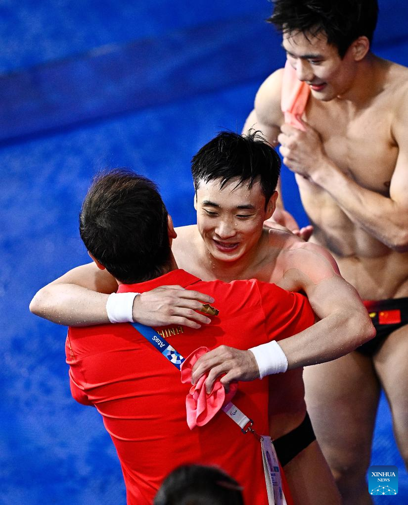 SAINT-DENIS, 10 agosto, 2024 (Xinhua) -- Cao Yuan de China es felicitado al término de la final de plataforma masculina de 10 metros de saltos en los Juegos Olímpicos de París 2024, en Saint-Denis, Francia, el 10 de agosto de 2024. (Xinhua/Wang Peng)