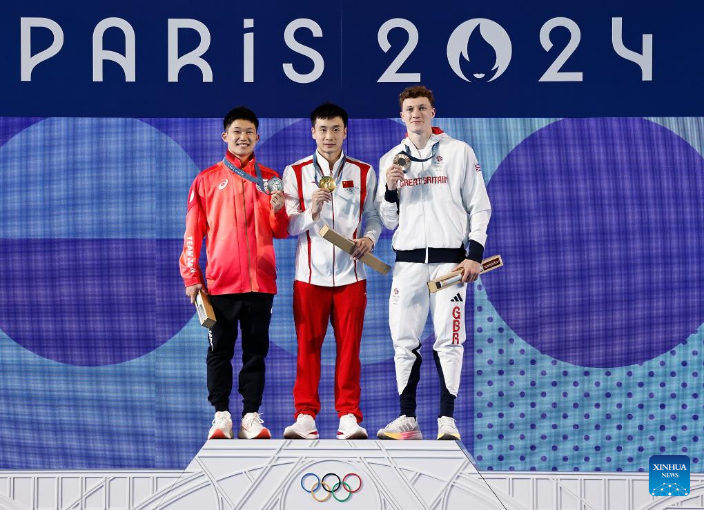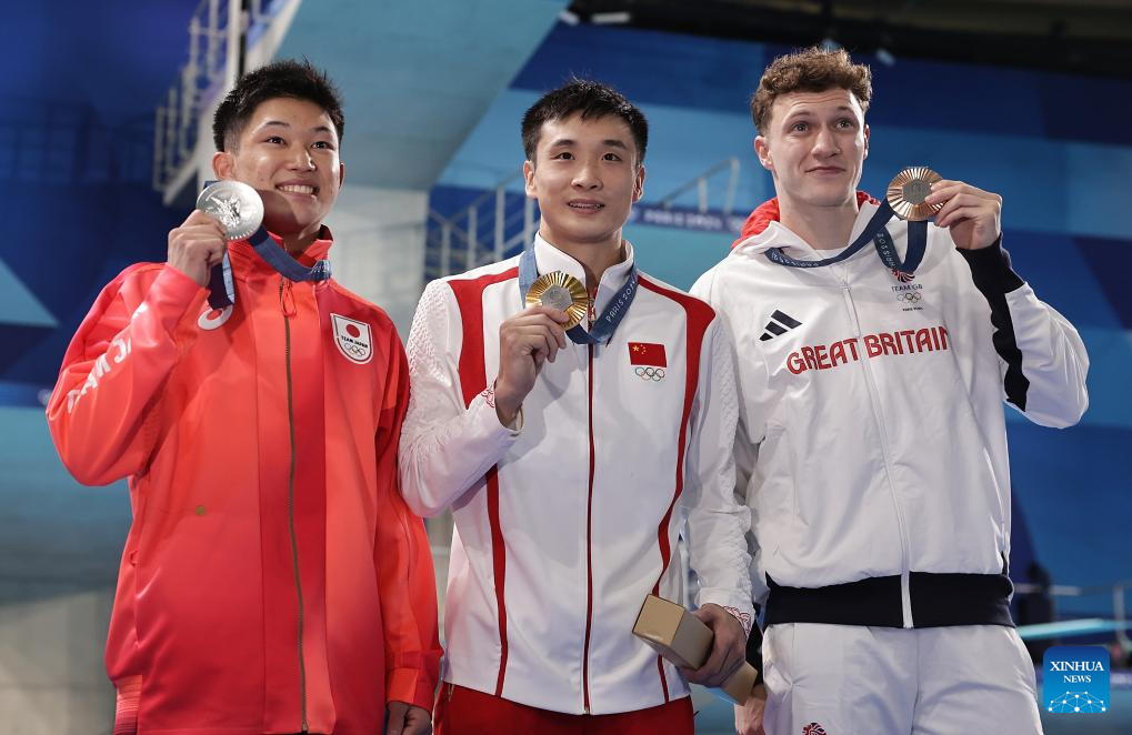SAINT-DENIS, 10 agosto, 2024 (Xinhua) -- El medallista de oro Cao Yuan (c) de China, el medallista de plata Rikuto Tamai (i) de Japón y el medallista de bronce Noah Williams de Reino Unido asisten a la ceremonia de premiación al término de la final de plataforma masculina de 10 metros de saltos en los Juegos Olímpicos de París 2024, en Saint-Denis, Francia, el 10 de agosto de 2024. (Xinhua/Zhang Yuwei)
