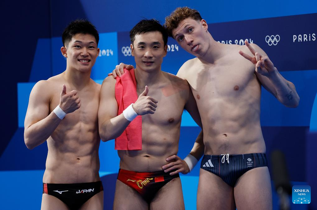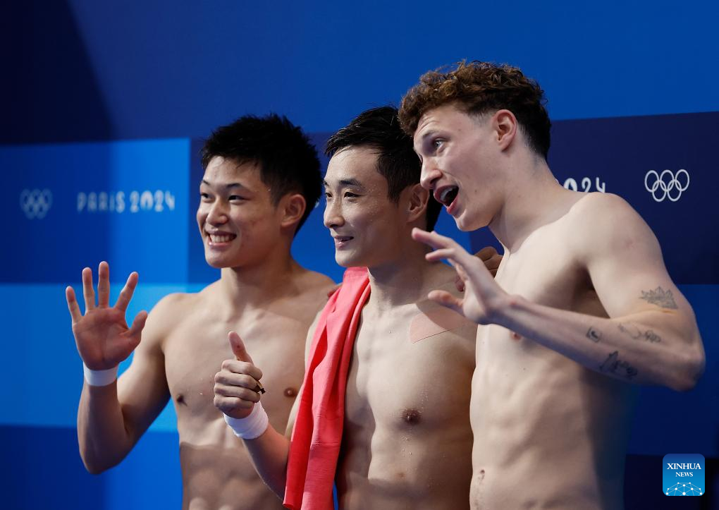 SAINT-DENIS, 10 agosto, 2024 (Xinhua) -- Cao Yuan (c) de China, Rikuto Tamai (i) de Japón y Noah Williams de Reino Unido posan al término de la final de plataforma masculina de 10 metros de saltos en los Juegos Olímpicos de París 2024, en Saint-Denis, Francia, el 10 de agosto de 2024. (Xinhua/Zhang Yuwei)