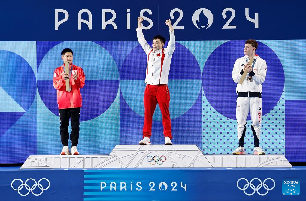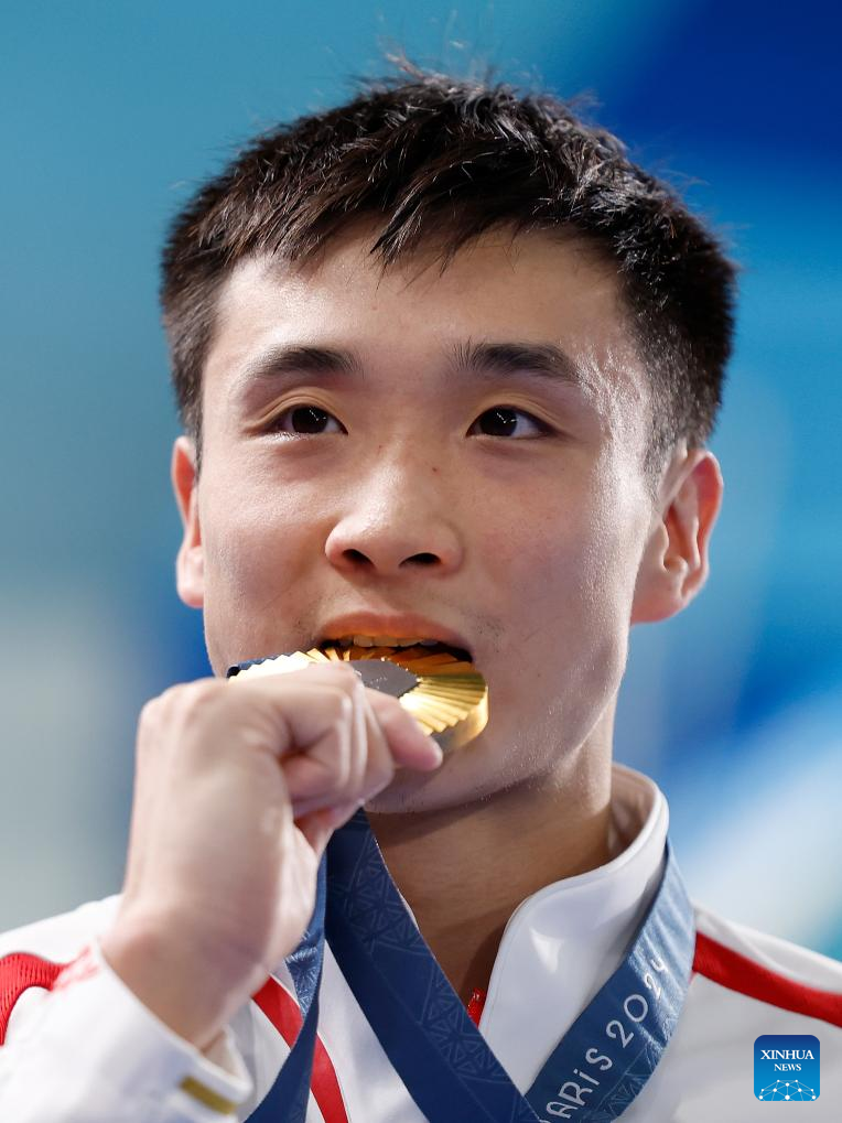 SAINT-DENIS, 10 agosto, 2024 (Xinhua) -- El medallista de oro Cao Yuan de China asiste a la ceremonia de premiación al término de la final de plataforma masculina de 10 metros de saltos en los Juegos Olímpicos de París 2024, en Saint-Denis, Francia, el 10 de agosto de 2024. (Xinhua/Zhang Yuwei)