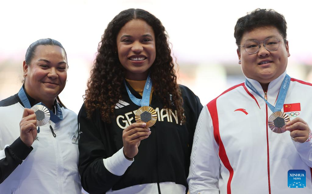 PARIS, 10 agosto, 2024 (Xinhua) -- La medallista de oro Yemisi Ogunleye (c) de Alemania, la medallista de plata Maddison-Lee Wesche (i) de Nueva Zelanda y la medallista de bronce Song Jiayuan de China reaccionan durante la ceremonia de victoria del Lanzamiento de peso femenino de atletismo en los Juegos Olímpicos de París 2024, en París, Francia, el 10 de agosto de 2024. (Xinhua/Li Gang)