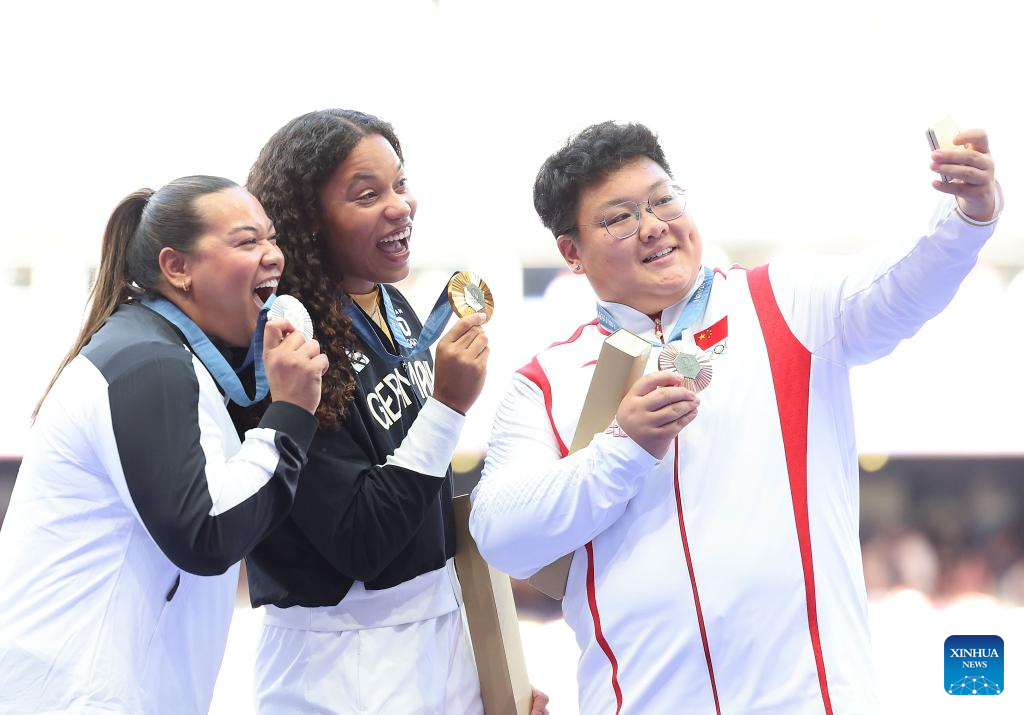 PARIS, 10 agosto, 2024 (Xinhua) -- La medallista de oro Yemisi Ogunleye (c) de Alemania, la medallista de plata Maddison-Lee Wesche (i) de Nueva Zelanda y la medallista de bronce Song Jiayuan de China se toman fotografías durante la ceremonia de victoria del Lanzamiento de peso femenino de atletismo en los Juegos Olímpicos de París 2024, en París, Francia, el 10 de agosto de 2024. (Xinhua/Li Gang)