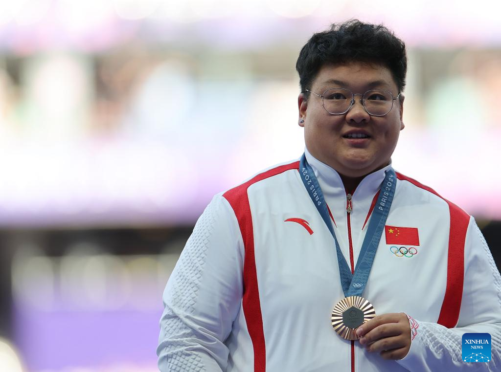 PARIS, 10 agosto, 2024 (Xinhua) -- La medallista de bronce Song Jiayuan de China reacciona durante la ceremonia de victoria de lanzamiento de peso femenino de atletismo en los Juegos Olímpicos de París 2024, en París, Francia, el 10 de agosto de 2024. (Xinhua/Li Gang)