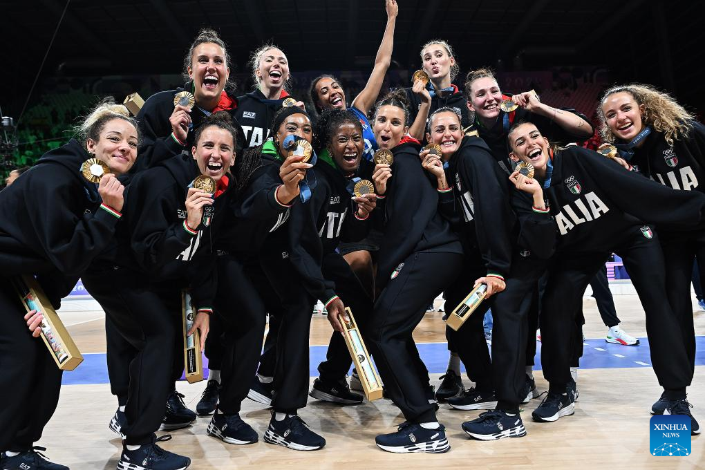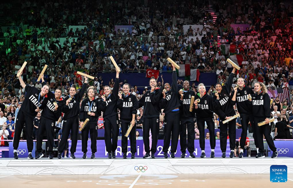 PARIS, 11 agosto, 2024 (Xinhua) -- Las medallistas de oro del equipo de Italia festejan durante la ceremonia de premiación al término de la final de voleibol femenino entre Italia y Estados Unidos en los Juegos Olímpicos de París 2024, en París, Francia, el 11 de agosto de 2024. (Xinhua/Liu Dawei)