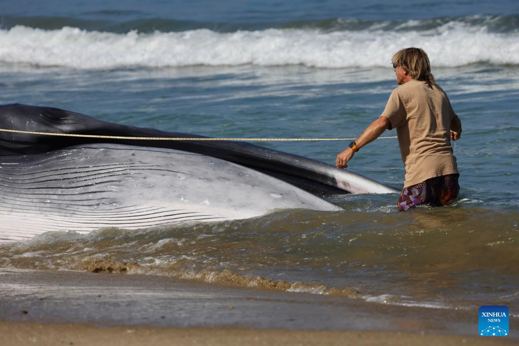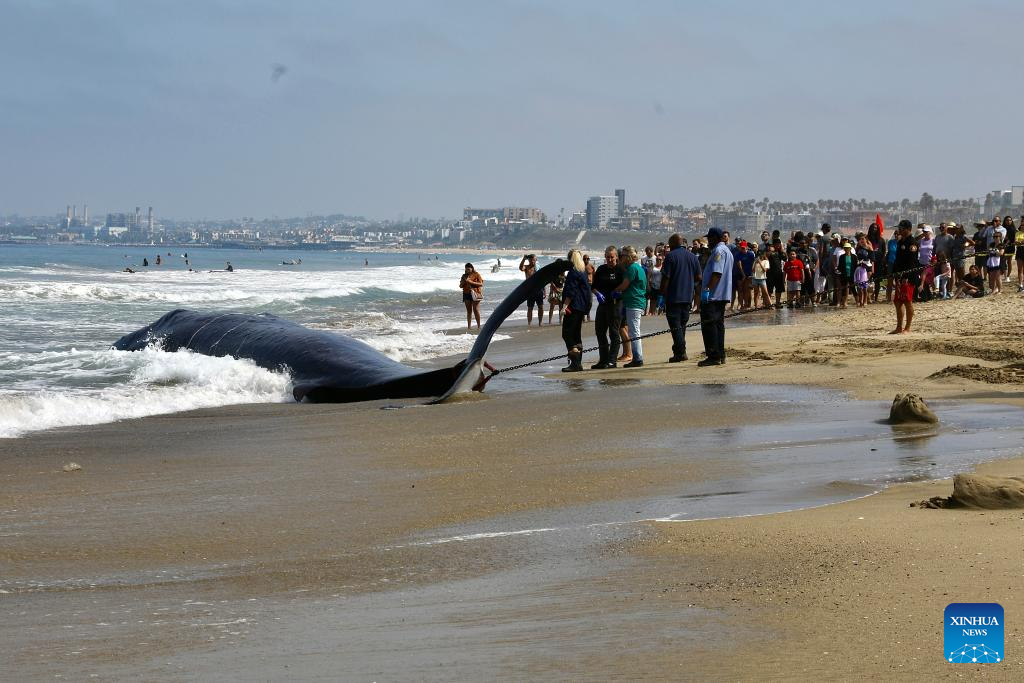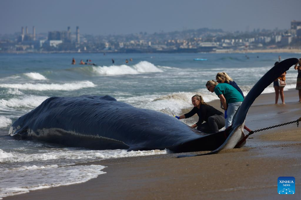 LOS ANGELES, 12 agosto, 2024 (Xinhua) -- Imagen del 11 de agosto de 2024 de especialistas en vida silvestre tratando de determinar la causa de muerte de una ballena de aleta arrastrada por la corriente en la playa de Torrance, en el condado de Los Angeles, California, Estados Unidos. La ballena de aleta muerta de 51 pies de longitud (aproximadamente 15,5 metros de largo), arrastrada por la corriente el sábado por la noche, murió antes de que los rescatistas pudieran llegar. (Xinhua/Qiu Chen)