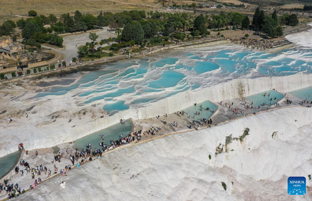 DENIZLI, 13 agosto, 2024 (Xinhua) -- Vista aérea tomada con un dron el 11 de agosto de 2024 de una escena de Pamukkale, en Denizli, Turquía. Pamukkale, o Castillo de Algodón, es una de las principales atracciones turísticas turcas conocida por su travertino blanco formado por cascadas naturales calcificadas y una serie de cuencas en terrazas. (Xinhua/Liu Lei)