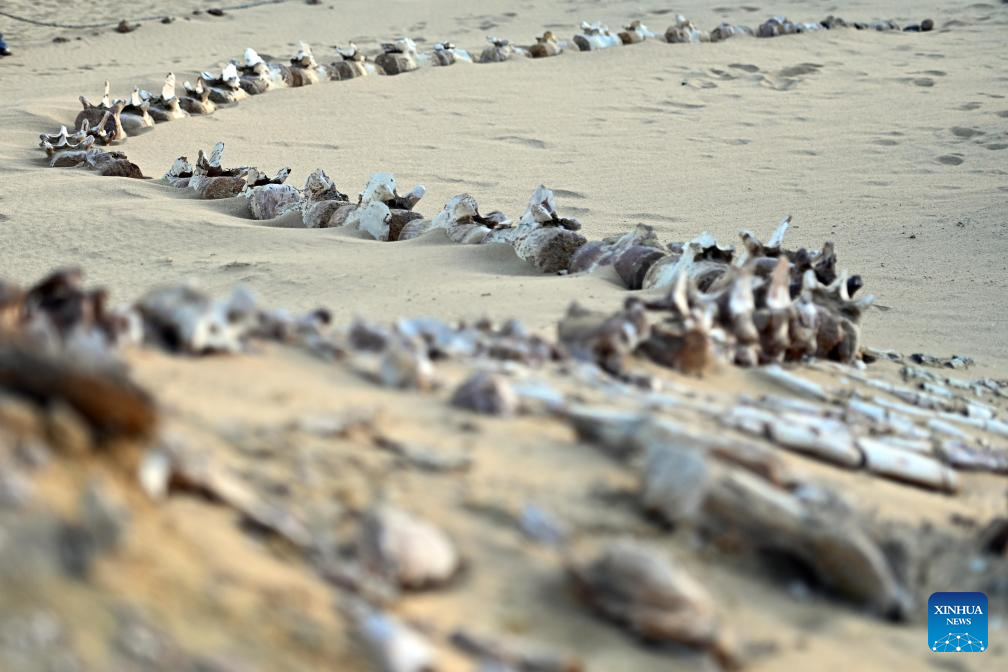 EL CAIRO, 13 agosto, 2024 (Xinhua) -- Imagen del 12 de agosto de 2024 de restos de fósiles de ballenas, en el Wadi Al-Hitan, en Fayum, Egipto. El Wadi Al-Hitan, o Valle de las Ballenas, ubicado en el desierto de Fayum, contiene restos fósiles de valor incalculable del suborden de ballenas más antiguo y ahora extinto, Archaeoceti. (Xinhua/Ahmed Gomaa)