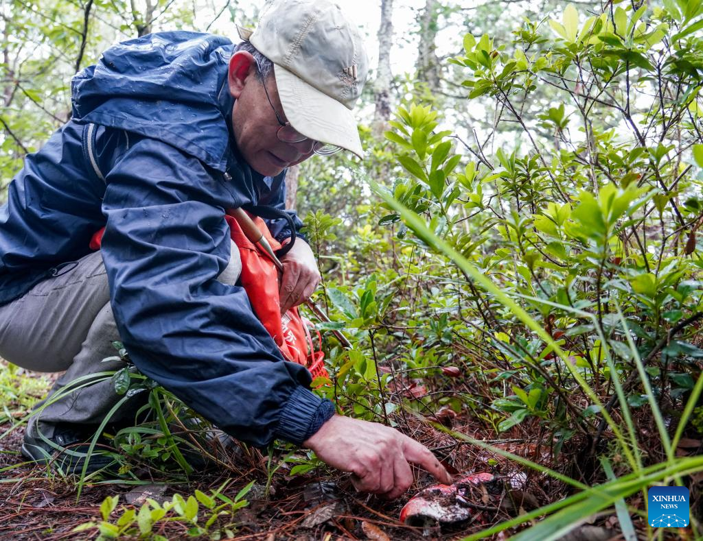 KUNMING, 13 agosto, 2024 (Xinhua) -- Imagen del 4 de agosto de 2024 de un hombre recolectando hongos silvestres durante un "recorrido de recolección de hongos", en Kunming, en la provincia de Yunnan, en el suroeste de China. Varios visitantes hacen un viaje especial a Yunnan para participar en recorridos de recolección de hongos, cuando las abundantes lluvias y las temperaturas moderadas de la provincia marcan el comienzo de una temporada excelente para los hongos silvestres cada verano. (Xinhua/Wang Jingyi)