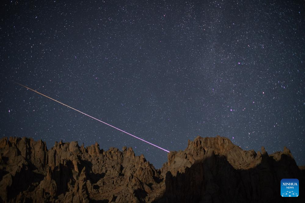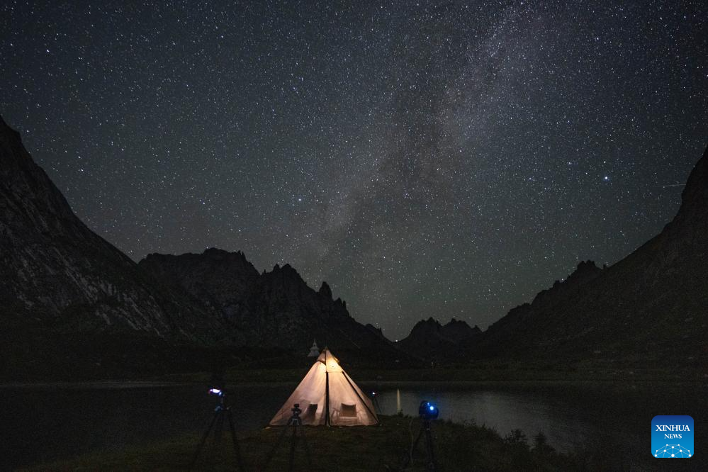 ABA, 13 agosto, 2024 (Xinhua) -- Imagen del 12 de agosto de 2024 de la lluvia de meteoros Perseidas sobre el área escénica y de interés histórico de Huanglong en la prefectura autónoma de las etnias tibetana y qiang de Aba, en la provincia de Sichuan, en el suroeste de China. (Xinhua/Dai Jianfeng)