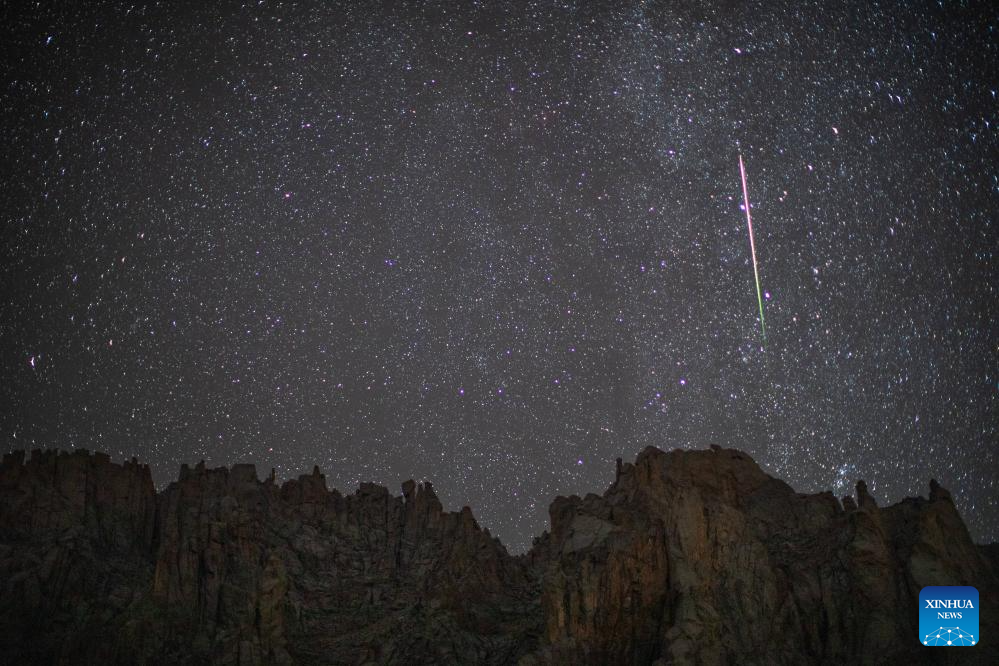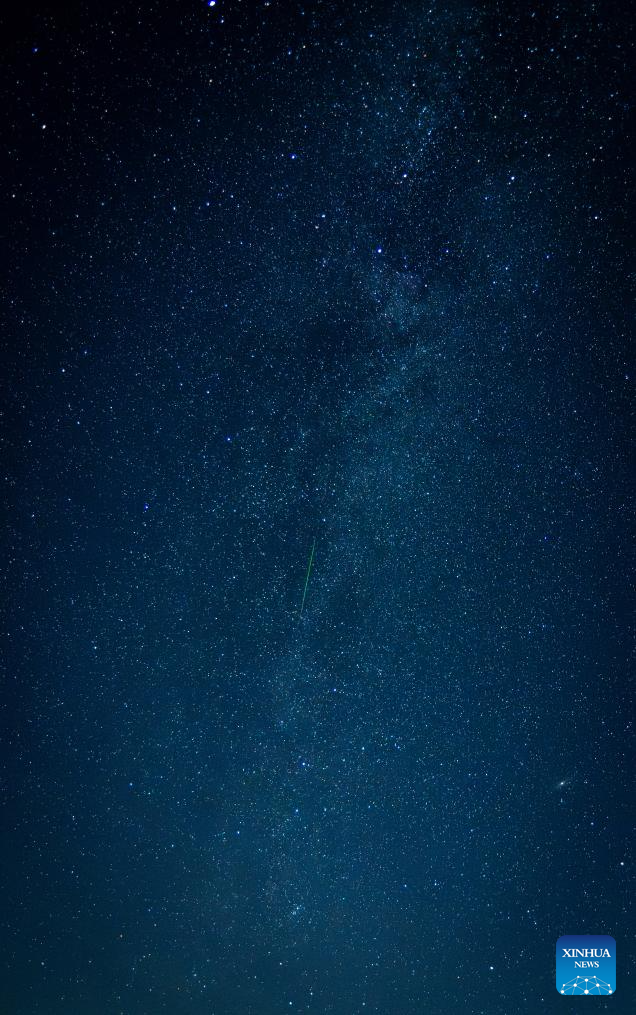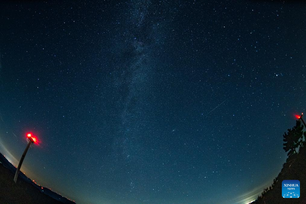 ABA, 13 agosto, 2024 (Xinhua) -- Imagen del 12 de agosto de 2024 de la lluvia de meteoros Perseidas sobre el área escénica de Lianbaoyeze, en el distrito de Aba, en la provincia de Sichuan, en el suroeste de China. (Xinhua/Jiang Hongjing)