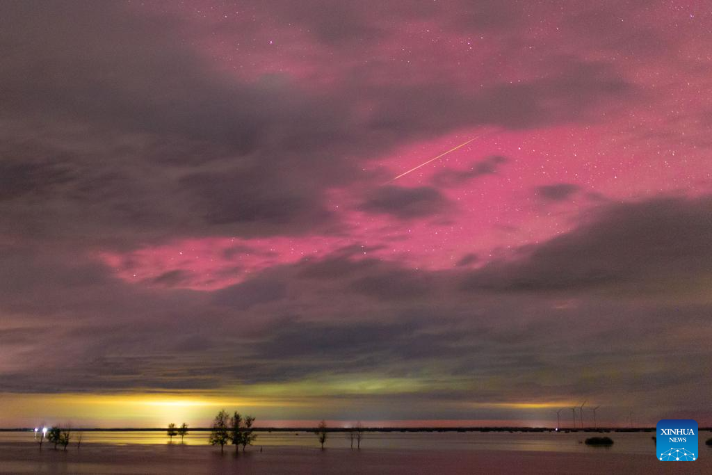 HARBIN, 13 agosto, 2024 (Xinhua) -- Imagen del 13 de agosto de 2024 de una lluvia de meteoros Perseidas y una aurora sobre una sección del río Songhua, en la ciudad de Jiamusi, en la provincia de Heilongjiang, en el noreste de China. (Xinhua/Chen Zhiguo)