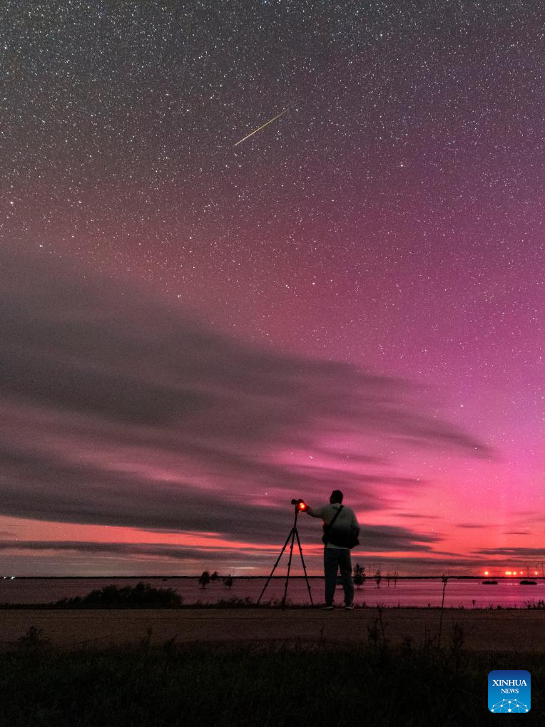 HARBIN, 13 agosto, 2024 (Xinhua) -- Imagen del 12 de agosto de 2024 de una lluvia de meteoros Perseidas y una aurora sobre una sección del río Songhua, en la ciudad de Jiamusi, en la provincia de Heilongjiang, en el noreste de China. (Xinhua/Qu Yubao)