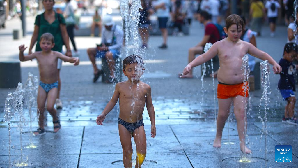 PRAGA, 14 agosto, 2024 (Xinhua) -- Niños juegan en una fuente de agua durante una ola de calor, en Praga, República Checa, el 14 de agosto de 2024. (Xinhua/Dana Kesnerova)