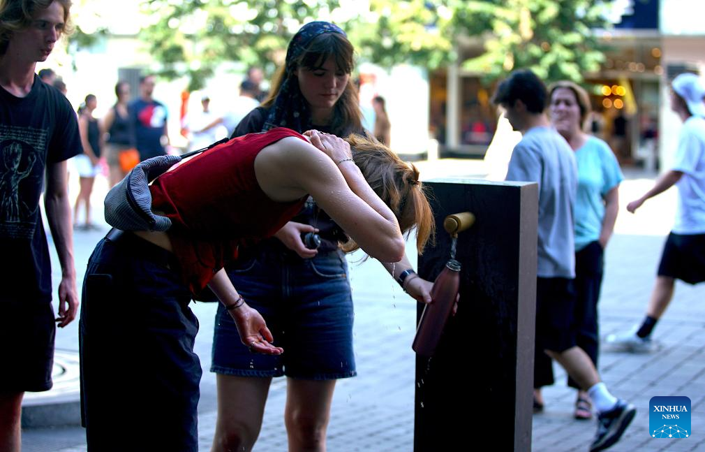 PRAGA, 14 agosto, 2024 (Xinhua) -- Una mujer se refresca con agua durante una ola de calor, en Praga, República Checa, el 14 de agosto de 2024. (Xinhua/Dana Kesnerova)