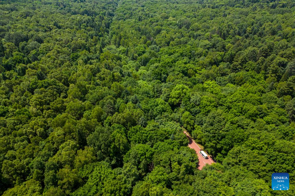 BEIJING, 14 agosto, 2024 (Xinhua) -- Imagen aérea tomada con un dron el 11 de julio de 2024 de un vehículo circulando en el parque forestal del arroyo Shangganling, en Yichun, en la provincia de Heilongjiang, en el noreste de China. Como la parte oriental del Programa de la Franja Forestal Protectora de los Tres Nortes (TSFP, por sus siglas en inglés), un proyecto de forestación a gran escala, el noreste de China ha experimentado una mejora continua del entorno ecológico. China propuso en junio de 2023 convertir el TSFP en una "Gran Muralla verde" completamente funcional e irrompible y una barrera de seguridad ecológica en el norte de China. Lanzado en 1978, el TSFP tiene como objetivo rehabilitar y reverdecer tierras propensas al desierto y áreas desertificadas en el noroeste, norte y noreste de China. (Xinhua/Zhang Tao)