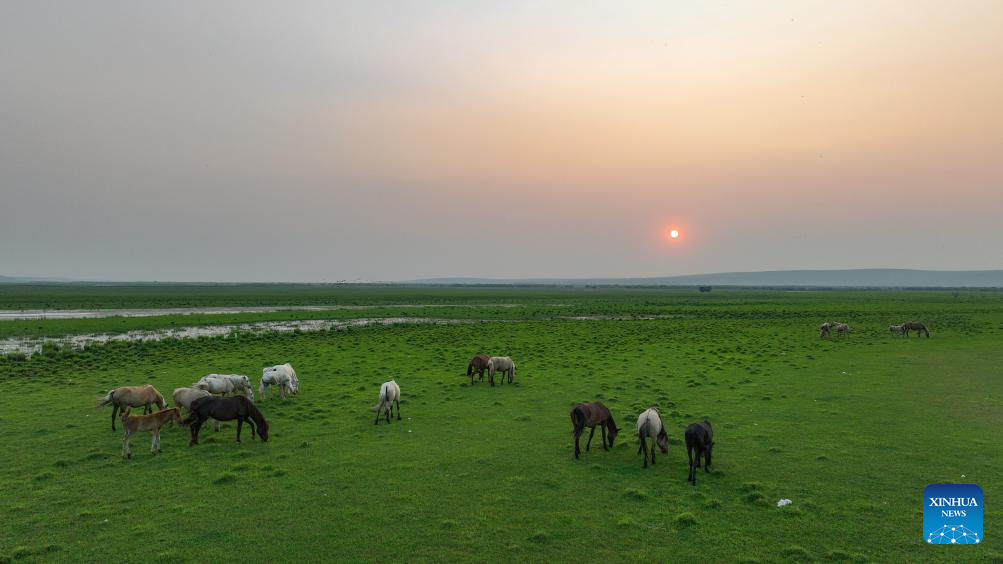 BEIJING, 14 agosto, 2024 (Xinhua) -- Imagen aérea tomada con un dron el 4 de julio de 2024 del paisaje del atardecer, en la Bandera Chen Barag de Hulun Buir, en la región autónoma de Mongolia Interior, en el norte de China. Como la parte oriental del Programa de la Franja Forestal Protectora de los Tres Nortes (TSFP, por sus siglas en inglés), un proyecto de forestación a gran escala, el noreste de China ha experimentado una mejora continua del entorno ecológico. China propuso en junio de 2023 convertir el TSFP en una "Gran Muralla verde" completamente funcional e irrompible y una barrera de seguridad ecológica en el norte de China. Lanzado en 1978, el TSFP tiene como objetivo rehabilitar y reverdecer tierras propensas al desierto y áreas desertificadas en el noroeste, norte y noreste de China. (Xinhua/Bei He)