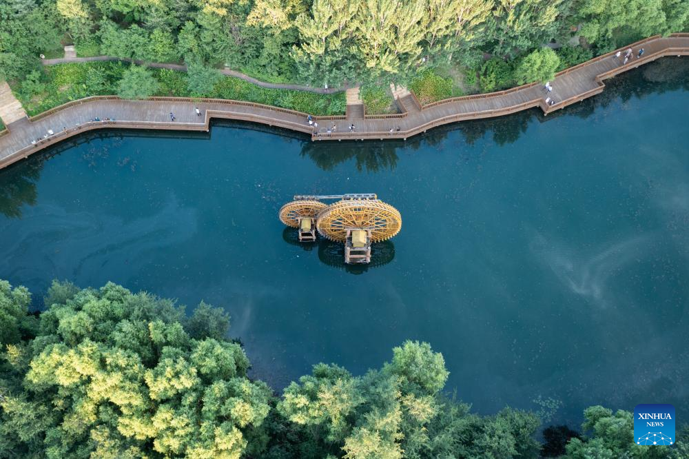 BEIJING, 14 agosto, 2024 (Xinhua) -- Imagen aérea tomada con un dron el 25 de julio de 2024 de personas caminando en un parque, en la ciudad de Suihua, en la provincia de Heilongjiang, en el noreste de China. Como la parte oriental del Programa de la Franja Forestal Protectora de los Tres Nortes (TSFP, por sus siglas en inglés), un proyecto de forestación a gran escala, el noreste de China ha experimentado una mejora continua del entorno ecológico. China propuso en junio de 2023 convertir el TSFP en una "Gran Muralla verde" completamente funcional e irrompible y una barrera de seguridad ecológica en el norte de China. Lanzado en 1978, el TSFP tiene como objetivo rehabilitar y reverdecer tierras propensas al desierto y áreas desertificadas en el noroeste, norte y noreste de China. (Xinhua/Xie Jianfei)