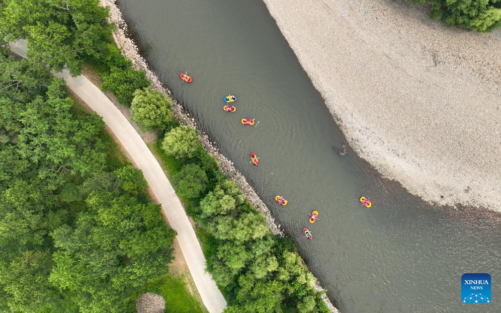 BEIJING, 14 agosto, 2024 (Xinhua) -- Imagen aérea tomada con un dron el 6 de julio de 2024 de turistas a la deriva en un lago, en la ciudad de Zhalantun, en la región autónoma de Mongolia Interior, en el norte de China. Como la parte oriental del Programa de la Franja Forestal Protectora de los Tres Nortes (TSFP, por sus siglas en inglés), un proyecto de forestación a gran escala, el noreste de China ha experimentado una mejora continua del entorno ecológico. China propuso en junio de 2023 convertir el TSFP en una "Gran Muralla verde" completamente funcional e irrompible y una barrera de seguridad ecológica en el norte de China. Lanzado en 1978, el TSFP tiene como objetivo rehabilitar y reverdecer tierras propensas al desierto y áreas desertificadas en el noroeste, norte y noreste de China. (Xinhua/Bei He)