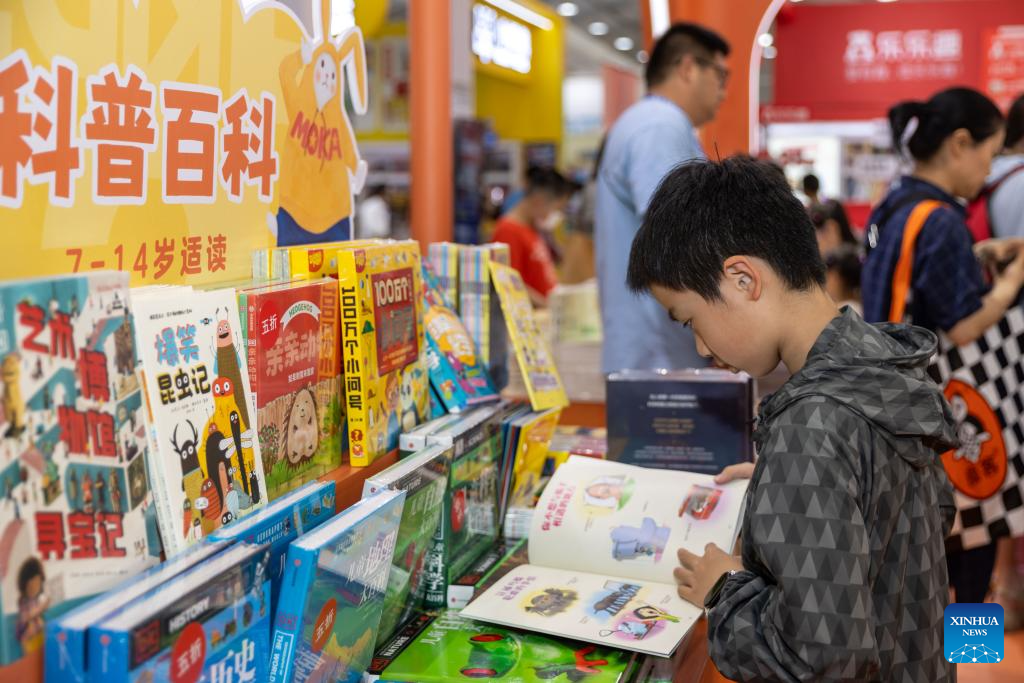 SHANGHAI, 14 agosto, 2024 (Xinhua) -- Un niño lee durante la Feria del Libro de Shanghai 2024, en Shanghai, en el este de China, el 14 de agosto de 2024. La feria del libro comenzó el miércoles y durará hasta el 20 de agosto. (Xinhua/Wang Xiang)