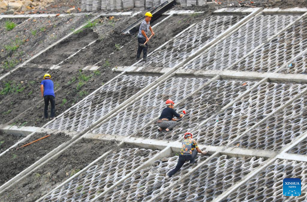 FUXIN, 15 agosto, 2024 (Xinhua) -- Imagen del 14 de agosto de 2024 de empleados restaurando una pendiente lateral en la Ciudad Internacional de Carreras del Centenario de Fuxin, en la ciudad de Fuxin, en la provincia de Liaoning, en el noreste de China. El centro de carreras de automóviles y motocicletas se transformó de una mina abandonada gracias a años de restauración ecológica. (Xinhua/Yang Qing)