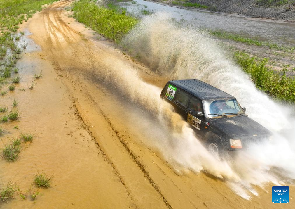 FUXIN, 15 agosto, 2024 (Xinhua) -- Imagen tomada con un dron del 14 de agosto de 2024 de un automóvil de carreras entrenando en la Ciudad Internacional de Carreras del Centenario de Fuxin, en la ciudad de Fuxin, en la provincia de Liaoning, en el noreste de China. El centro de carreras de automóviles y motocicletas se transformó de una mina abandonada gracias a años de restauración ecológica. (Xinhua/Yang Qing)