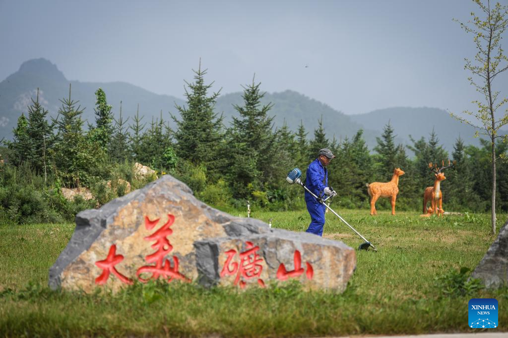 BENXI, 15 agosto, 2024 (Xinhua) -- Un trabajador poda el césped en la mina a cielo abierto de hierro de Nanfen, en Benxi, provincia de Liaoning, en el noreste de China, el 15 de agosto de 2024. La mina a cielo abierto de hierro de Nanfen, en la provincia de Liaoning, en el noreste de China, en los últimos años ha estado realizando esfuerzos para promover el desarrollo verde y sostenible. (Xinhua/Pan Yulong)