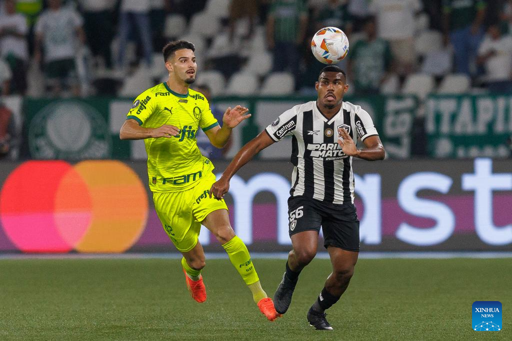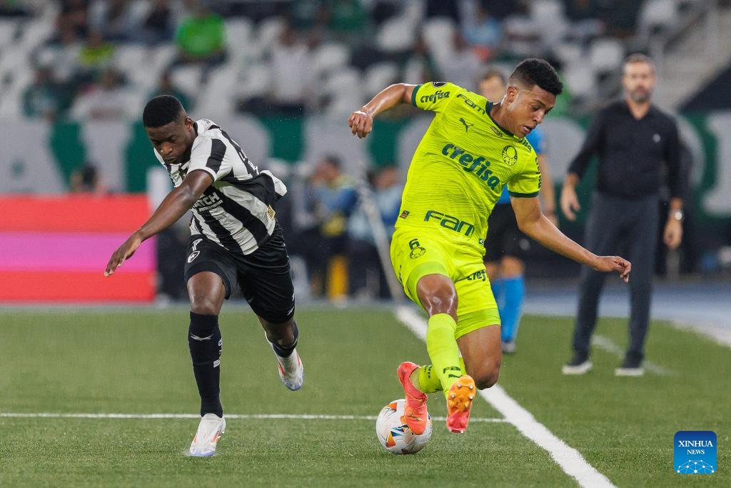RIO DE JANEIRO, 15 agosto, 2024 (Xinhua) -- Imagen del 14 de agosto de 2024 del jugador Cuiabano (d), de Botafogo de Brasil, disputando el balón con José López (i), de Palmeiras de Brasil, durante el partido de ida correspondiente a los octavos de final de la Copa Conmebol Libertadores, celebrado en el Estadio Nilton Santos, en Río de Janeiro, Brasil. (Xinhua/Claudia Martini)