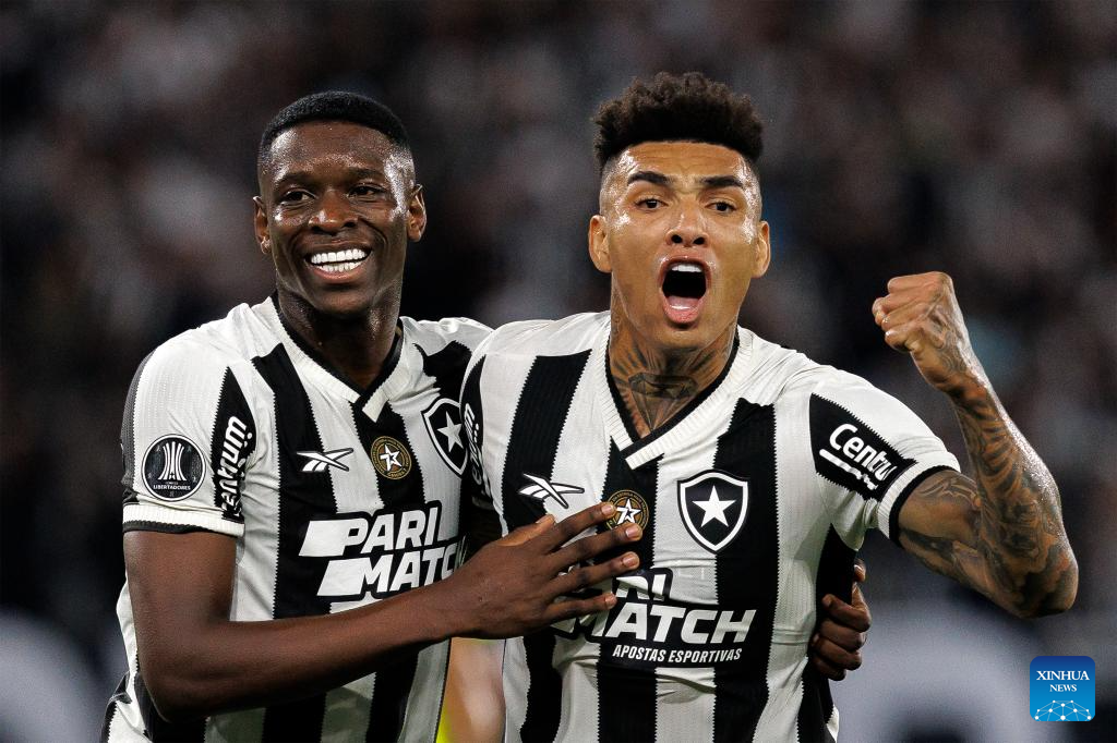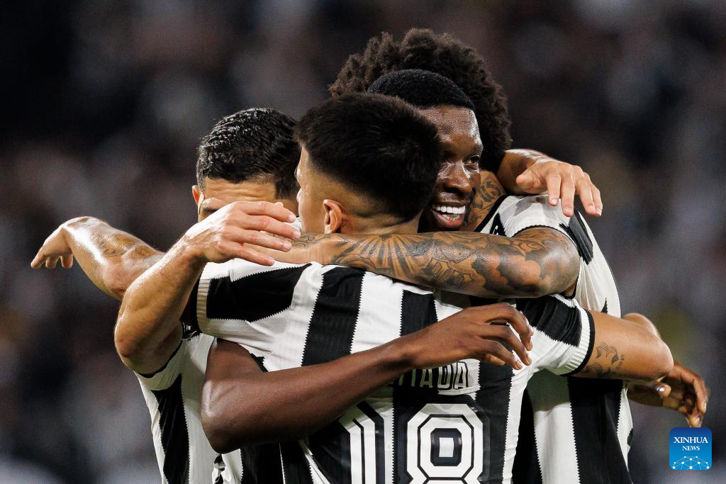 RIO DE JANEIRO, 15 agosto, 2024 (Xinhua) -- Imagen del 14 de agosto de 2024 del jugador Luiz Henrique (c), de Botafogo de Brasil, festejando su anotación con sus compañeros durante el partido de ida correspondiente a los octavos de final de la Copa Conmebol Libertadores ante Palmeiras de Brasil, celebrado en el Estadio Nilton Santos, en Río de Janeiro, Brasil. (Xinhua/Claudia Martini)