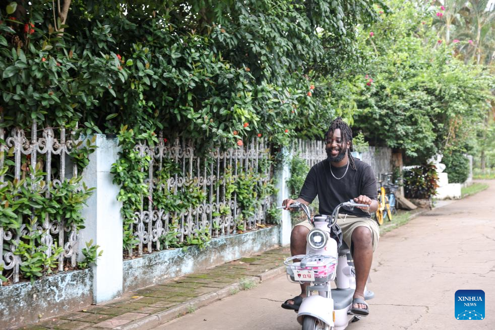 HAIKOU, 15 agosto, 2024 (Xinhua) -- Imagen del 14 de agosto de 2024 de David Mouk conduciendo en un complejo residencial, en Haikou, en la provincia de Hainan, en el sur de China. Como profesor de piano y músico de banda, David proviene de la República del Congo y ha estado viviendo en Hainan desde hace casi 10 años. Habiendo estudiado música desde la infancia, formó su propia banda mientras estaba en la universidad y luego vino aquí para realizar una maestría. El músico cree firmemente que la música es una parte indispensable de la vida y puede brindar poder a las personas. Por lo tanto fundó un estudio de música para enseñar a los niños a tocar el piano. Fuera del estudio, David toca el teclado en varias bandas. "Considero a Hainan como mi segundo hogar y deseo hacer más música hermosa aquí", dijo David. (Xinhua/Zhang Liyun)